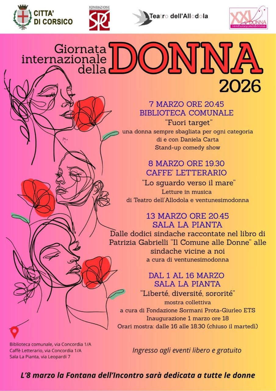 A Corsico il programma è promosso dal Comune in collaborazione con ventunesimodonna, Teatro dell’Allodola e Fondazione Sormani Prota – Giurleo ETS. L’8 marzo la Fontana dell’Incontro sarà simbolicamente dedicata a tutte le donne.