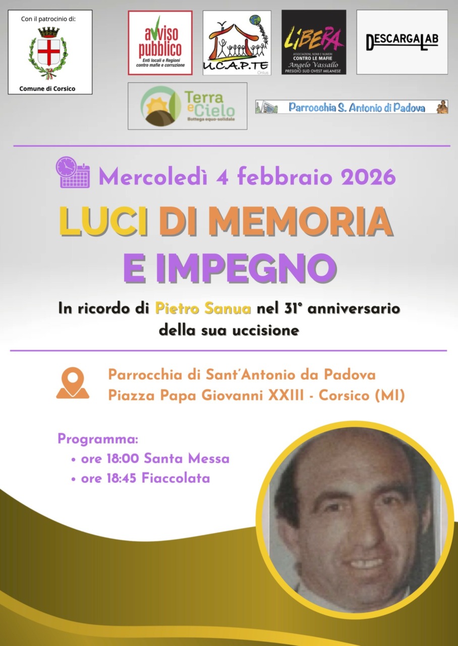 Il secondo momento si svolgerà mercoledì 4 febbraio a Corsico, presso la Parrocchia di Sant’Antonio da Padova in piazza Papa Giovanni XXIII, con l’iniziativa “Luci di memoria e impegno”. Alle ore 18 sarà celebrata la Santa Messa in ricordo di Pietro Sanua, seguita alle 18.45 da una fiaccolata per le vie cittadine, realizzata con il patrocinio del Comune di Corsico.