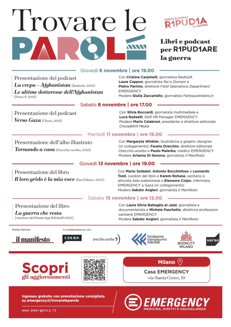 MILANO – Dal 6 al 15 novembre a Casa Emergency in via Santa Croce, 19 si terrà il ciclo di incontri “Trovare le parole: libri e podcast per R1PUD1ARE la guerra” la rassegna culturale dell’ong con la partecipazione di scrittori, artisti e giornalisti per riflettere sull’idea di pace e sul valore delle parole nella costruzione di un mondo senza guerra. Quest’edizione avrà come media partner il quotidiano il Manifesto.