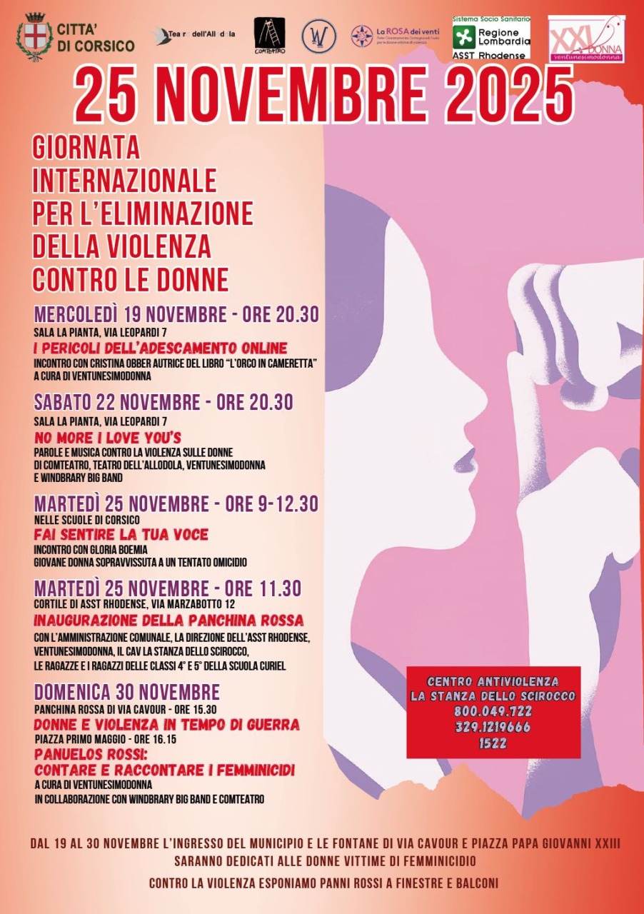 Il 25 novembre, le scuole di Corsico incontrano Gloria Boemia, giovane donna sopravvissuta a un tentato omicidio e, alle 11.30, nel cortile dell’Asst Rhodense di via Marzabotto, è prevista l’inaugurazione della panchina rossa (insieme al Centro antiviolenza di Corsico e agli studenti delle classi quarte e quinte della scuola Curiel).