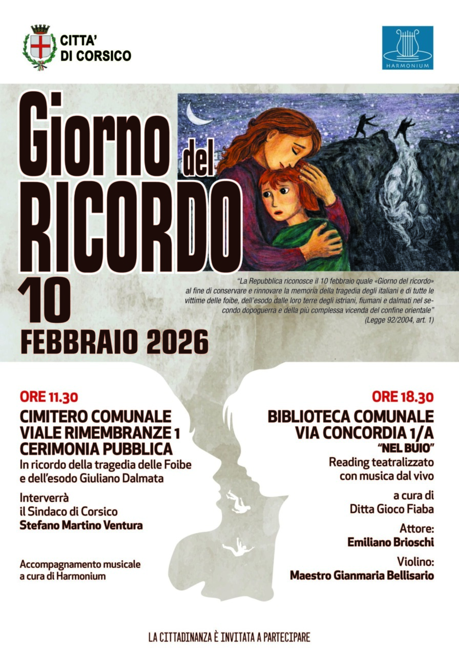 CORSICO – Anche a Corsico si terranno le celebrazioni del Giorno del Ricordo. Anche per i corsichesi l’appuntamento organizzato dall’Amministrazione comunale è per martedì 10 febbraio 2026, alle ore 11.30, presso il Cimitero comunale in viale Rimembranze 1 dove si terrà una cerimonia pubblica in ricordo della tragedia delle foibe e dell’esodo giuliano dalmata.