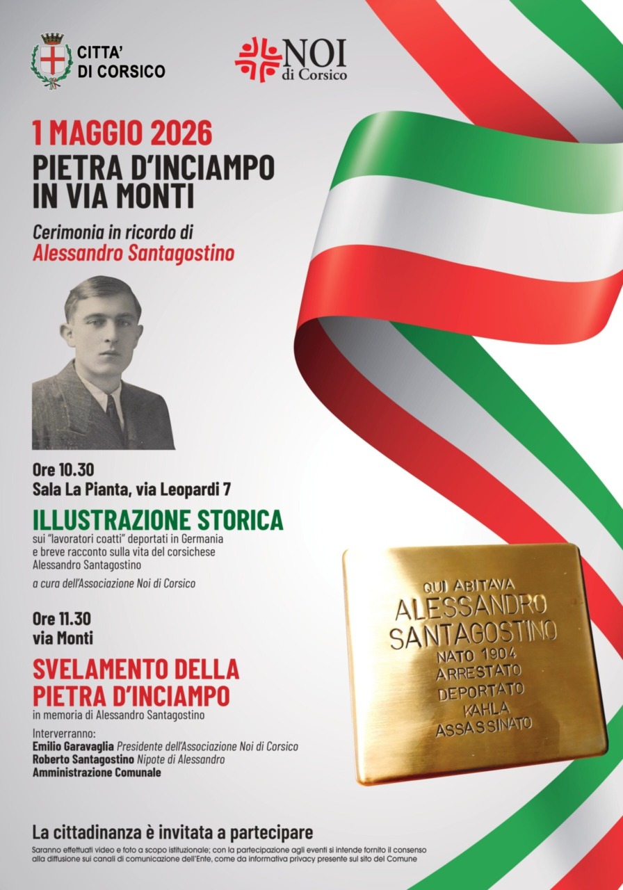 CORSICO – Venerdì 1° maggio 2026 il Comune di Corsico insieme all’associazione Noi di Corsico promuove un’iniziativa pubblica per ricordare le vittime della deportazione nazista, con lo svelamento di una Pietra d’inciampo dedicata ad Alessandro Santagostino.