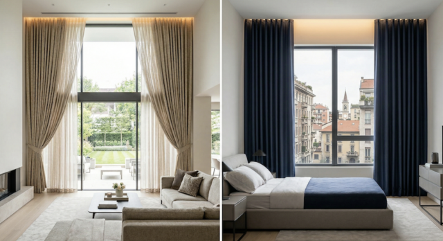 - La Sartorialità: A differenza dei prodotti industriali, ogni tenda viene cucita artigianalmente. Questo significa cuciture invisibili, orli perfetti e una caduta del tessuto che segue le linee della casa senza difetti.