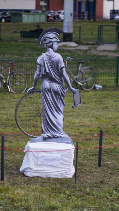 MILANO – Una classica statua greca indossa un caschetto da ciclista, impugna una ruota e dall’altra un bloster, un mix tra moderno e antico, un omaggio alle migliaia di persone che tutti i giorni si muovono per la città in bici. La statua è stata realizzata dal comitato ‘Non Vediamo l’ora’, che da tempo chiede al Comune di Milano la realizzazione di una pista ciclabile sul ponte della Ghisolfa, uno dei tratti stradali più pericolosi della città, e la cui realizzazione era previsto dal Bilancio Partecipativo 2017/18.