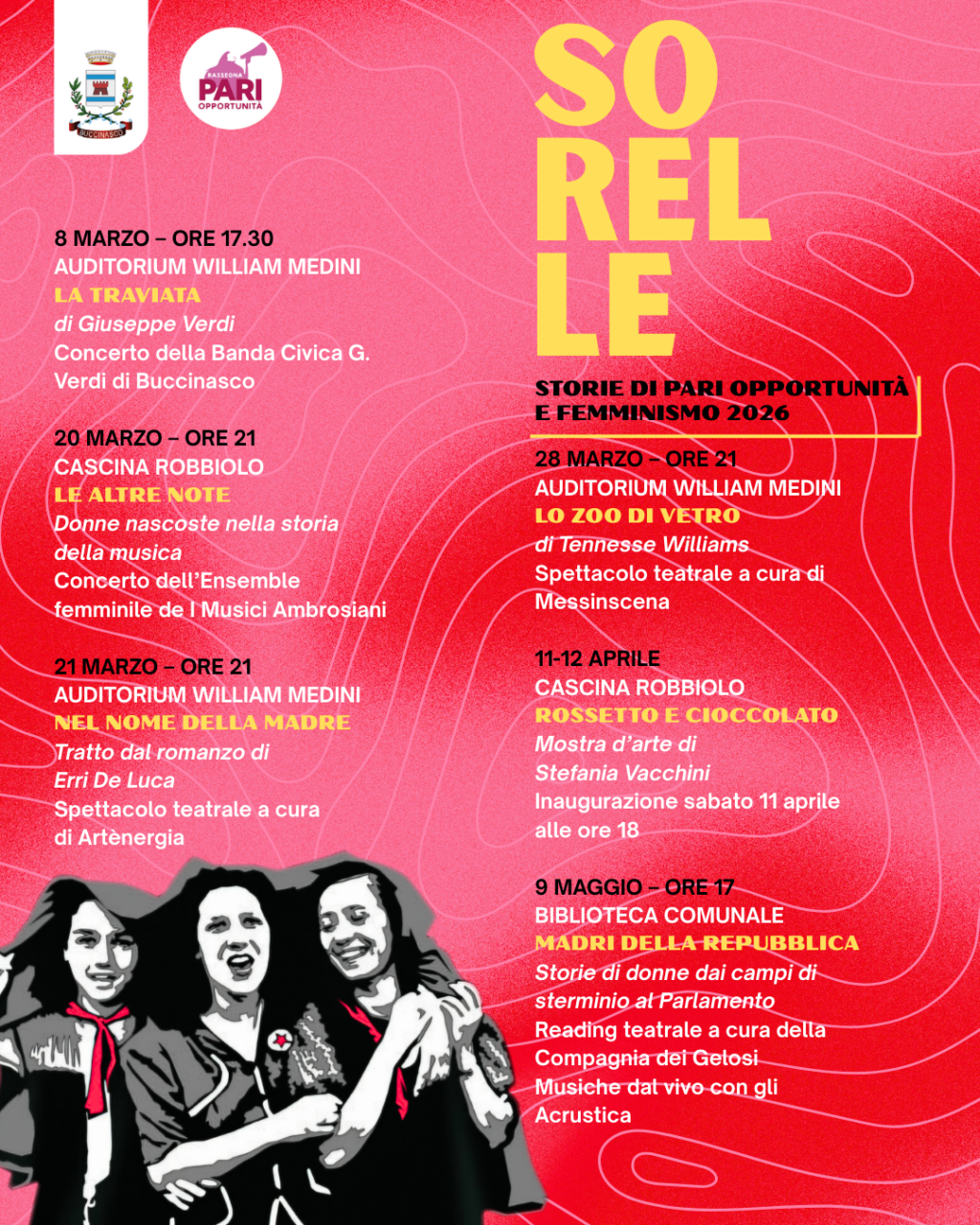 Proseguono a Buccinasco gli appuntamenti dell’edizione 2026 della rassegna “Sorelle. Storie di parità e femminismo”, promossa dagli assessorati alla Cultura e alle Pari opportunità insieme alle associazioni del territorio.