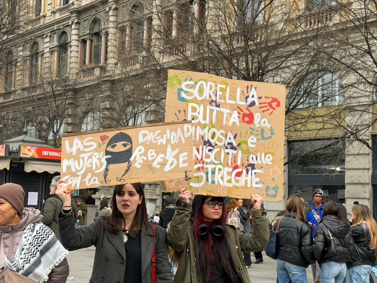 Ad aprire la manifestazione lo striscione “Disarmiamo guerra e patriarcato”. Lungo il percorso sono comparsi numerosi cartelli contro i conflitti e contro il ddl Bongiorno. Un grande poster con la scritta “Senza consenso è stupro, senza dissenso è fascismo” è stato inoltre affisso sul grattacielo Pirelli, sede del Consiglio regionale della Lombardia.